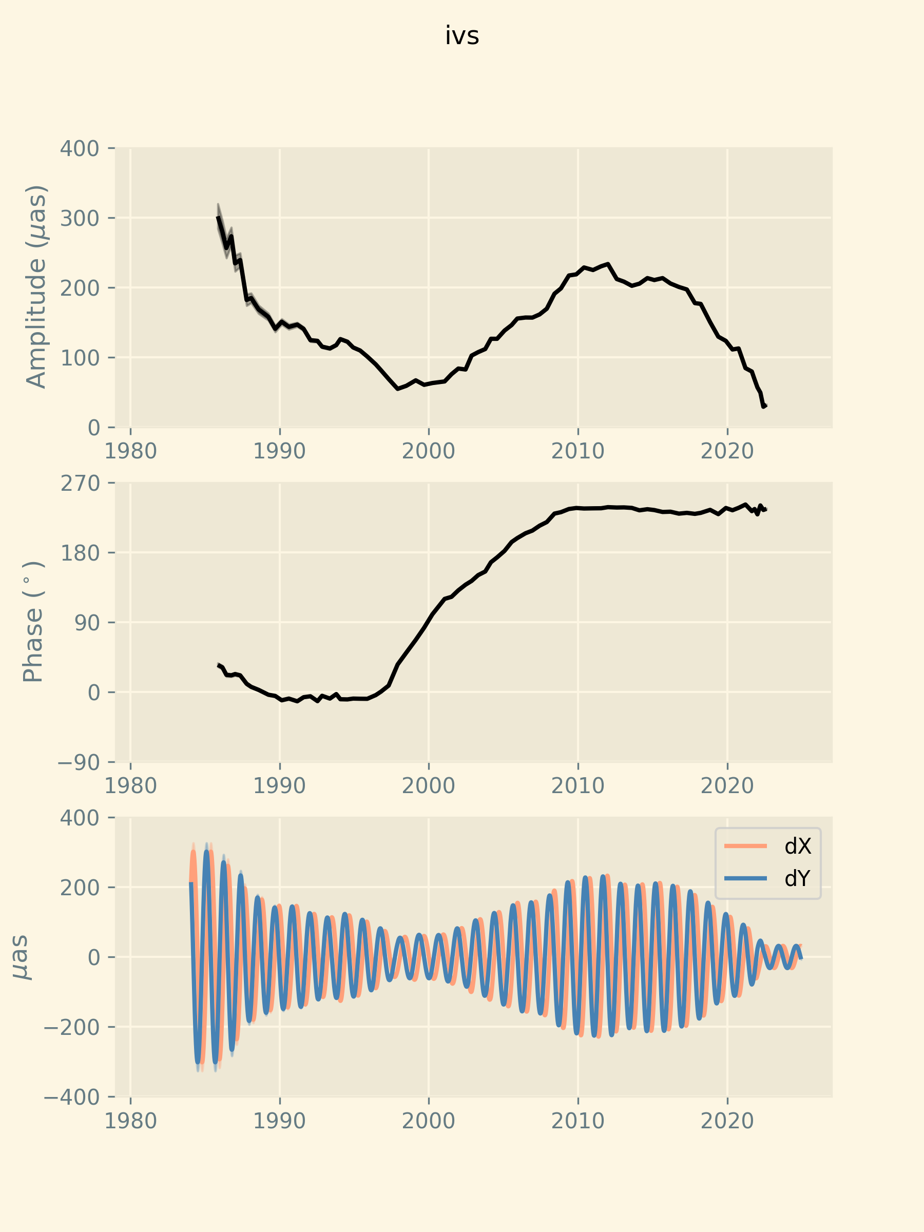 where A is the searched complex amplitude of the FCN. Yearly values of A are obtained by fitting over a sliding window of width 7 years and displaced by steps of half a year. The fit is applied to various nutation series submitted to or computed by the IERS Earth Orientation Center. The models are updated regularly, typically every week as series are updated by the analysis centers. For each series, we make available a table of the yearly amplitudes from which one can derive the nutation offsets at any epoch.